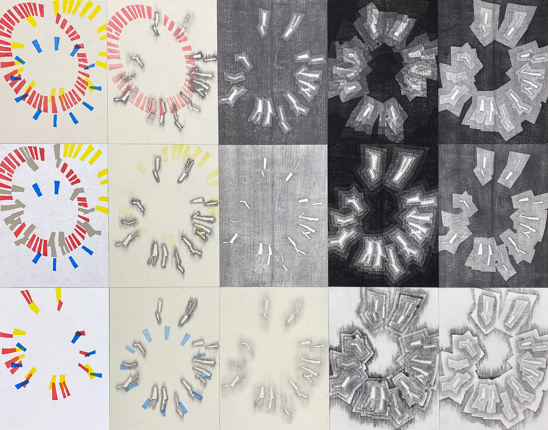 これらの作品では、版画の試みで時計のイメージの変換を行っていた。